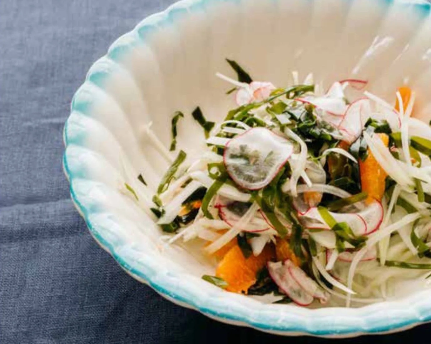 Combine the kelp, oranges, fennel, onion, radishes, vinegar and sesame oil in a large bowl.